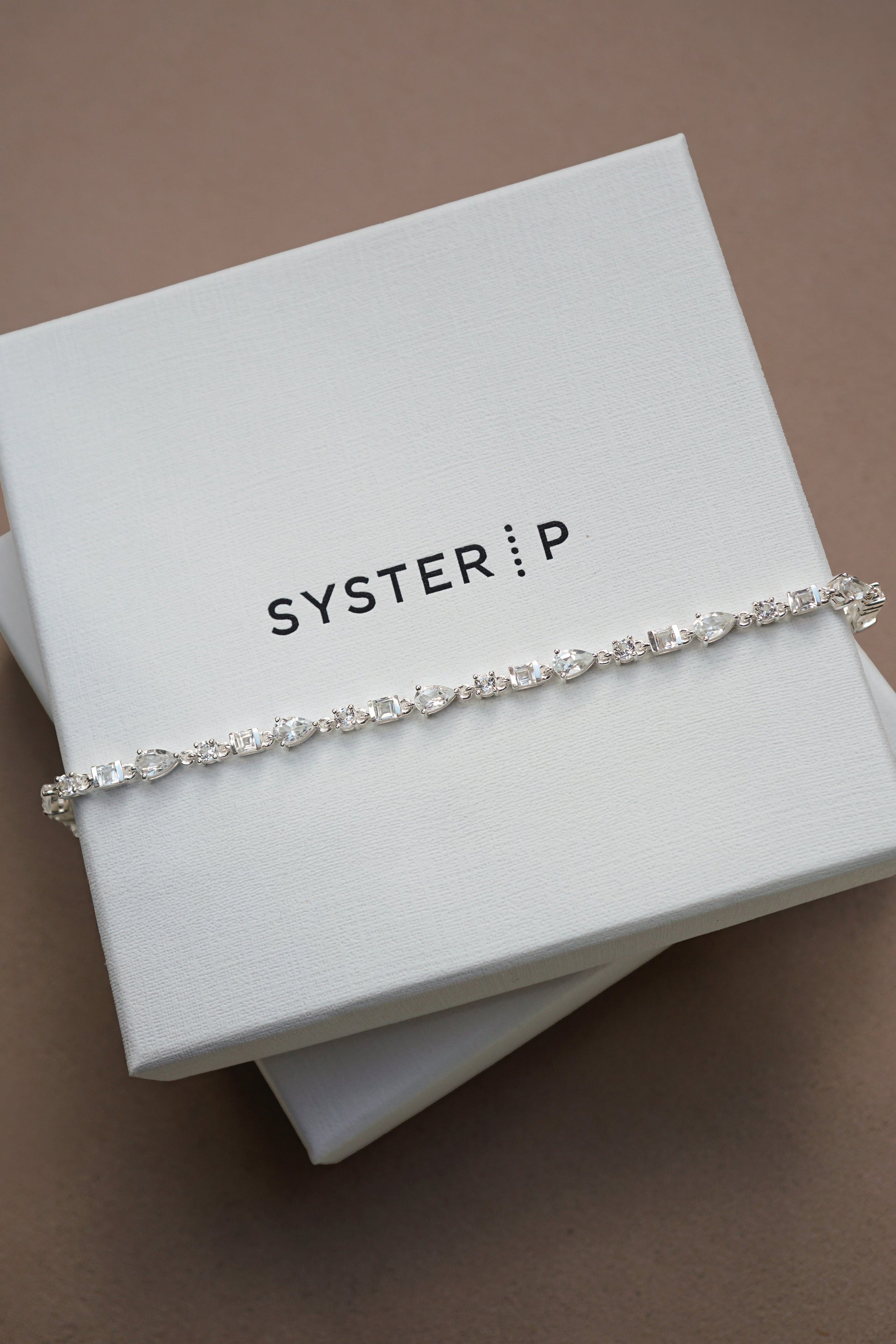 • Studio shot of the Layers Olivia Bracelet in silver, laid out in a circle. The bracelet features a delicate pattern of small, interconnected leaf-like links.A close-up on a model's arm and hand, showing a stack of silver jewelry. She wears the leaf-patterned Layers Olivia Bracelet, the delicate Sheer Station Bracelet, and the Bolded Drops Ring.A close-up image of the silver Layers Olivia Bracelet, detailing its unique pattern of small, interconnected leaf-like links.A close-up of a model's wrist wearing the Layers Olivia Bracelet in silver, featuring a pattern of small leaf-like links. It is layered with the Santa Monica Bracelet, a delicate silver chain with small, colorful beads.A model wears the Treasure Multi Pearl Bracelet in silver, a delicate chain with small freshwater pearls, styled with another silver bracelet featuring a repeating chevron link design.An exclusive Syster P jewelry box, presented both open and closed, showcasing its off-white exterior and soft interior.