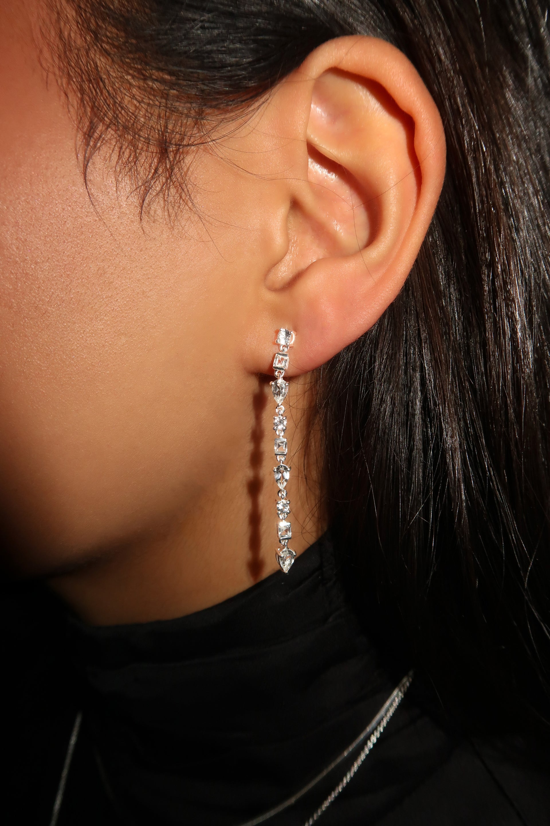 • A product shot of the Pam Hoops in silver, showcasing the pair of recycled sterling silver earrings adorned with a cluster of brilliant white topazes.A close-up shot of a model wearing the Pam Hoops in silver, adorned with sparkling white topazes, paired with a small silver stud in her second piercing.A close-up of a model wearing the Pam Hoops in silver, which are adorned with white topazes, and a small silver stud in her upper ear.A close-up shot of a model wearing the Pam Hoops Silver, featuring a classic silver hoop adorned with a beautiful white topaz.