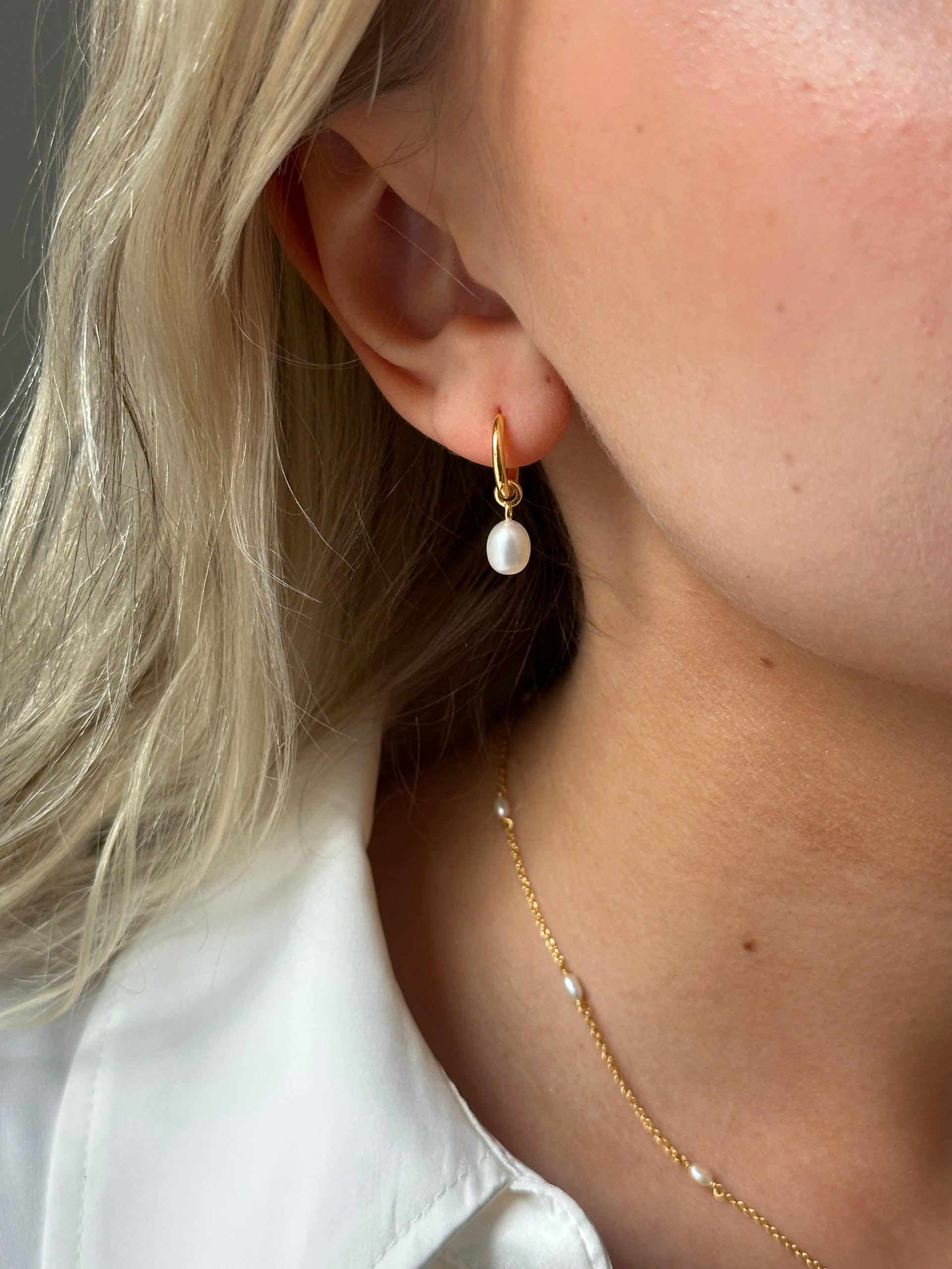 • A product shot of the Treasure Pearl Hoops in gold, highlighting the classic design of a simple hoop with a dangling freshwater pearl.A close-up of a model wearing the Treasure Pearl Hoops Gold, featuring a dangling freshwater pearl, alongside the smaller Beloved Twisted Small Hoops Gold.A product shot of the Treasure Pearl Hoops Gold, showing the pair of small gold hoops each with a dangling freshwater pearl.A close-up of a model wearing the Syster P Treasure Pearl Hoops in gold, featuring a delicate hoop with a single freshwater pearl drop. The fine gold chain of the Treasure Multi Pearl Necklace is also visible.All our jewelry is handmade and made from 100% recycled sterling silver.A styled product shot of the gold Treasure Pearl Hoops and the Treasure Multi Pearl Necklace, elegantly arranged on a white Syster P gift box tied with a black ribbon.