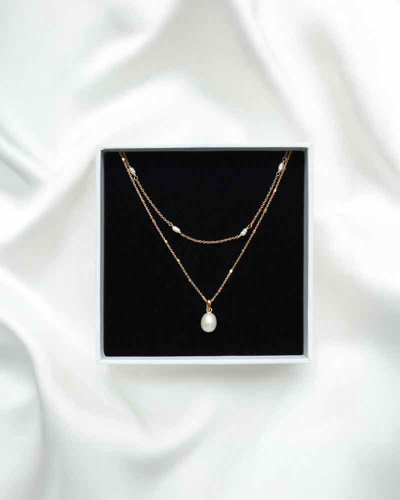 • The Treasure Necklace Set Silver is displayed in its white Syster P gift box, showcasing the two layered necklaces: one with a single teardrop freshwater pearl and another with multiple small pearls along its silver chain.A model wears the Treasure Necklace Set in silver, layered over a white collared shirt, featuring a shorter multi-pearl chain and a longer chain with a single pearl pendant.