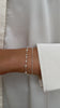 • A product shot of the Aurelia Bracelet in gold, laid out in a circle to display its unique shimmering chain and interspersed freshwater pearls.A close-up of a model's wrist wearing the Aurelia Bracelet in gold, which features small freshwater pearls, stacked with the Katie Bracelet, a fine gold chain with a teardrop-shaped crystal.A close-up product shot of the Aurelia Bracelet in gold, highlighting the detail of its unique chain and small freshwater pearls.A close-up shot of a model's wrist wearing the gold Aurelia Bracelet, featuring a unique chain with small freshwater pearls, stacked with the gold Katie Bracelet, a fine chain with a teardrop-shaped crystal charm.