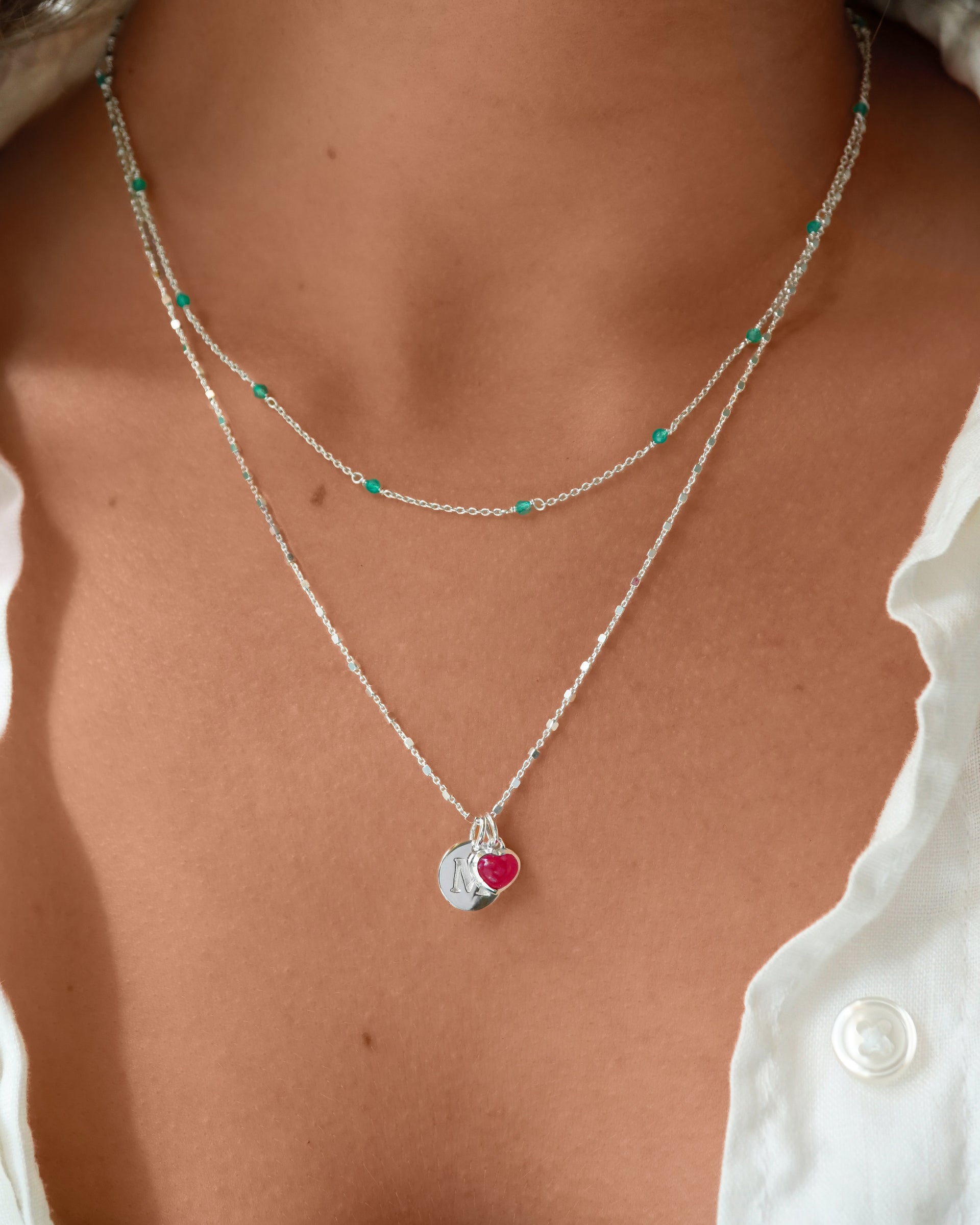 • A product shot of the Beloved Heart Pendant in silver, featuring a heart-shaped setting with a central green aventurine stone.A close-up shot of a model wearing the Beloved Heart Pendant in silver with a green aventurine stone, layered with another silver necklace. The pendant is styled on a silver chain with an initial charm, and the second necklace is a delicate chain with small, colorful beads.A product shot of a silver necklace featuring the Beloved Heart Pendant with a green aventurine stone, styled with a round silver pendant engraved with the initial 'A'.A smiling model wearing a layered silver necklace set, featuring the Beloved Heart Pendant with a green aventurine stone and a round silver disc pendant, styled with a shorter, delicate beaded necklace.