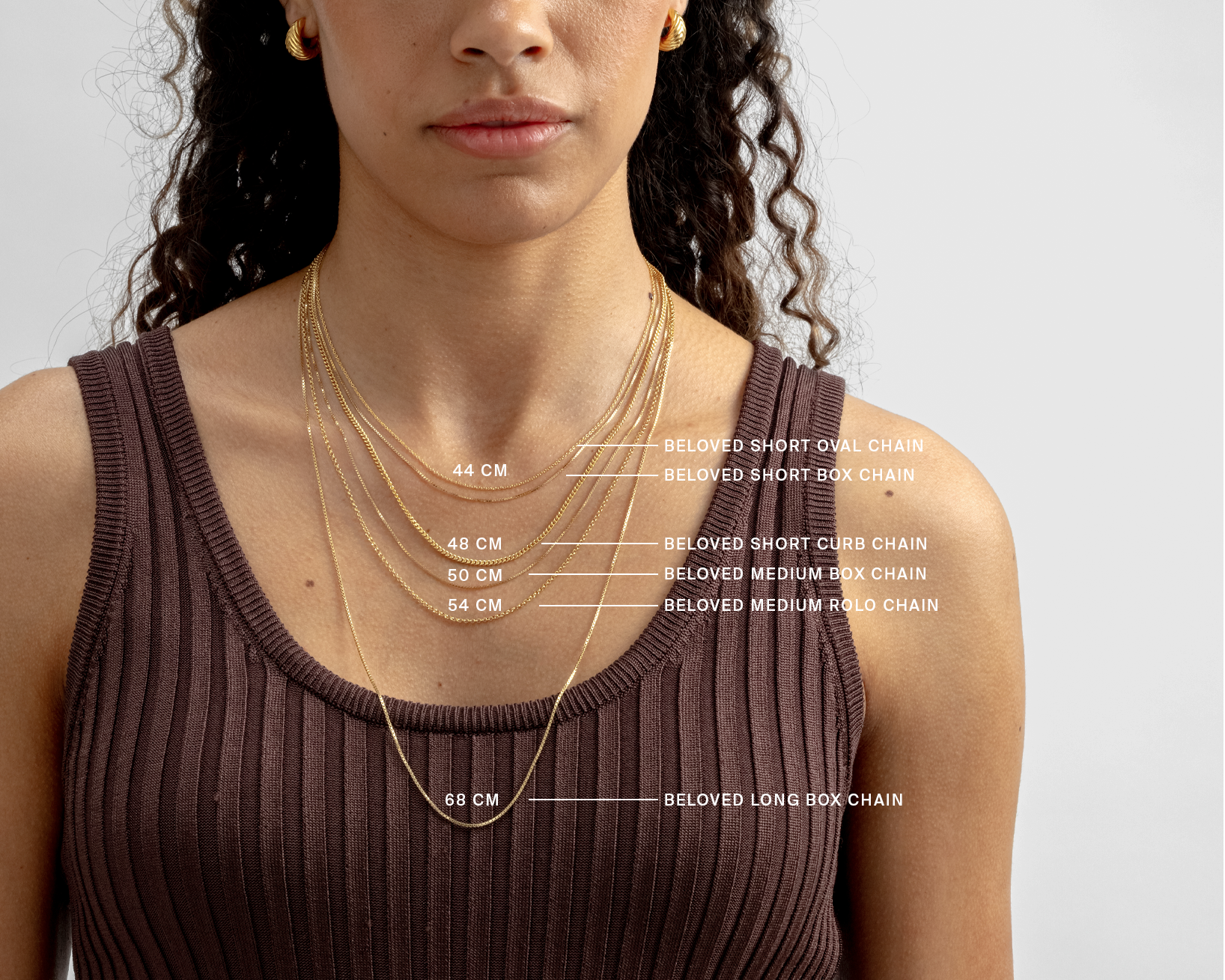 • A product shot of the Beloved Medium Box Chain in gold, showcasing its delicate box link design.A close-up shot of a model wearing two layered gold necklaces: the Sheer Mirror Necklace and the Beloved Medium Box Chain, which is personalized with a Beloved Heart Pendant and a Beloved Mini Letter 'M' pendant.A product shot of the Beloved Medium Box Chain in gold, styled with a small, circular pendant engraved with the letter E.A close-up shot of a model wearing two layered gold necklaces: the Sheer Mirror Necklace and the Beloved Medium Box Chain personalized with a pink quartz heart pendant and a Beloved Mini Letter pendant.A model showcasing five layered gold necklaces of different styles to illustrate chain lengths, which are marked on the image from 44 cm to 68 cm. The model is also wearing chunky, twisted gold earrings.