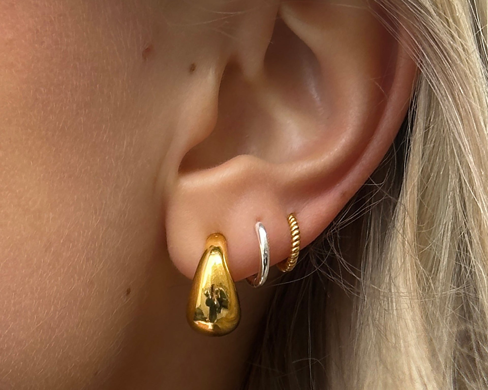 • A product shot of the Bolded Wavy Earrings in gold, showcasing their shiny finish and unique wavy hoop design.A close-up shot of a model wearing the Bolded Wavy Earrings in gold, highlighting their shiny and wavy design. A delicate silver chain necklace is also visible.A product shot of the Bolded Wavy Earrings in gold, showcasing their unique wavy design and shiny finish.