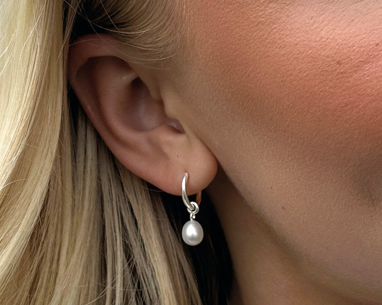 • A product shot of the Treasure Pearl Hoops Silver, showing the pair of sterling silver hoops, each with a dangling freshwater pearl.A close-up of a model wearing the Treasure Pearl Hoops Silver with its freshwater pearl drop, styled with the small Beloved Twisted Hoops in silver in a second piercing.A product shot of the Treasure Pearl Hoops Silver, featuring a pair of small silver hoops with dangling freshwater pearls.A close-up shot of a model wearing the Treasure Pearl Hoops in silver, featuring a delicate hoop with a dangling freshwater pearl.All our jewelry is handmade and made from 100% recycled sterling silver.A close-up of a model wearing the Treasure Pearl Hoop in silver, featuring a delicate hoop with a single dangling freshwater pearl.