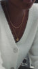 • A product shot of the Herringbone Twisted Necklace in silver, detailing its shimmering and intricate twisted chain design.A close-up shot of a model wearing the silver Herringbone Twisted Necklace layered with the silver Treasure Single Pearl Necklace.A close-up shot of the Herringbone Twisted Necklace in silver, highlighting the delicate and intricate twisted pattern of the chain.A close-up of a model wearing three layered silver necklaces: the smooth Sheer Mirror snake chain, a twisted silver chain, and the delicate Florientine necklace with a light blue aquamarine pendant.