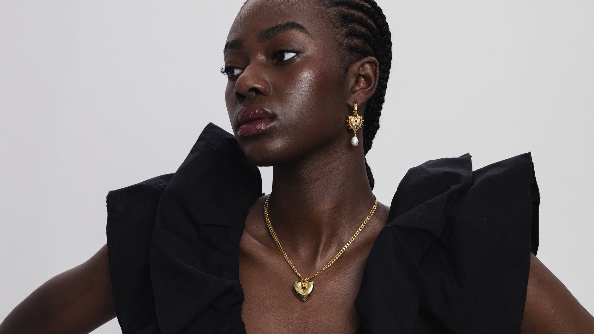 • A product shot of the Fat Heart Necklace in gold, featuring a chunky curb chain and a large, puffy heart-shaped pendant.A model styles the gold Fat Heart Necklace, featuring a chunky chain and a large heart pendant, with a Drama Queen Heart Pearl Earring that has a spiked heart charm and a pearl drop.The Fat Heart Necklace in gold, featuring a chunky chain and a large, puffy heart-shaped pendant, resting inside a white Syster P jewelry box.A close-up product shot of the Fat Heart Necklace in gold, highlighting its chunky chain and large, puffy heart pendant.A model shot of the gold Fat Heart Necklace with its chunky chain and pendant, paired with the gold Drama Queen Heart Pearl Earring which features a spiky heart design and a dangling pearl.