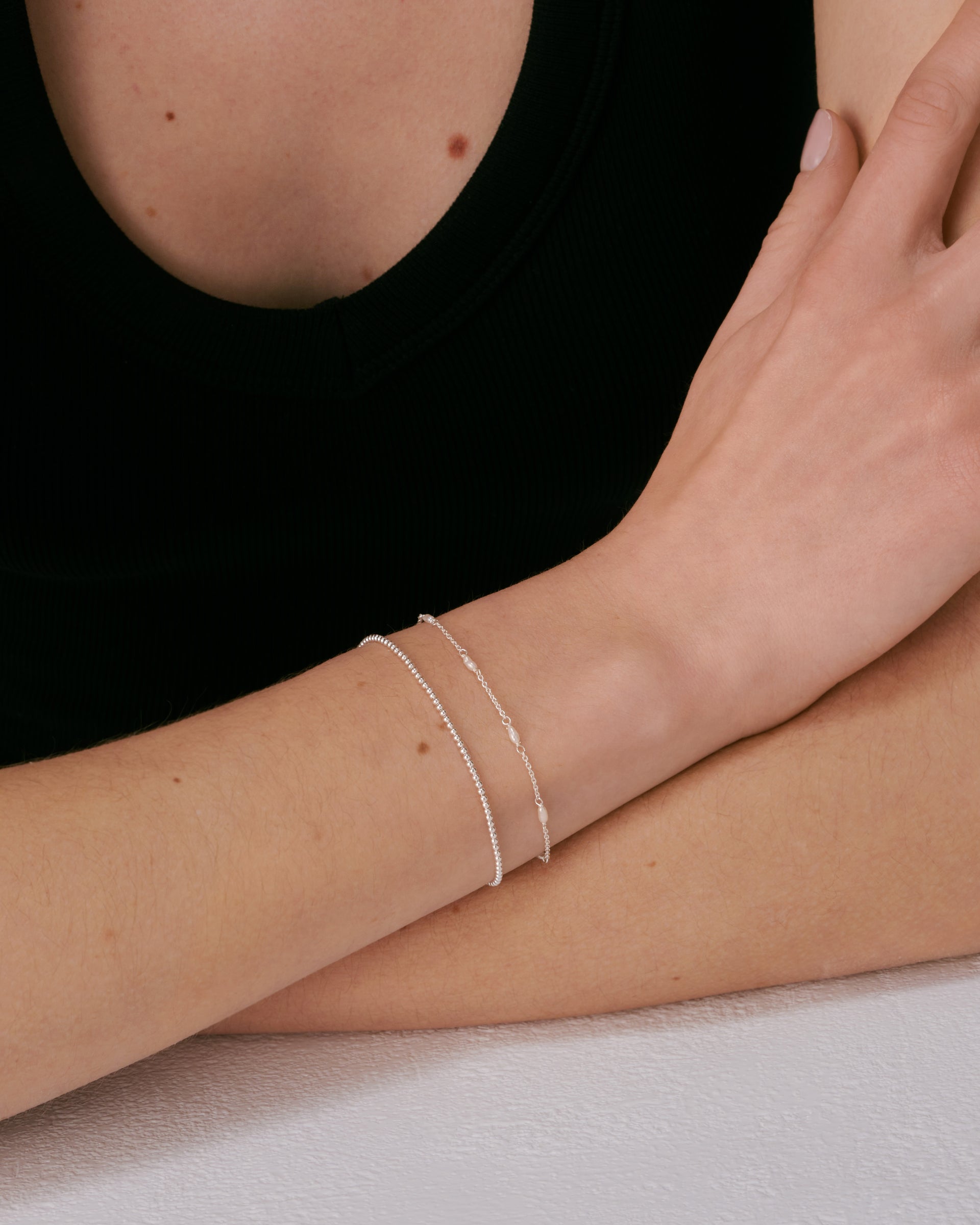 Ein zartes, minimalistisches Armband aus 925er Sterlingsilber, 100 % recycelt. Die perlenartige Kette des Sheer Doria Bracelets sorgt für ein sanftes Schimmern und eignet sich perfekt für den Alltag oder zum Kombinieren mit anderen Schmuckstücken.