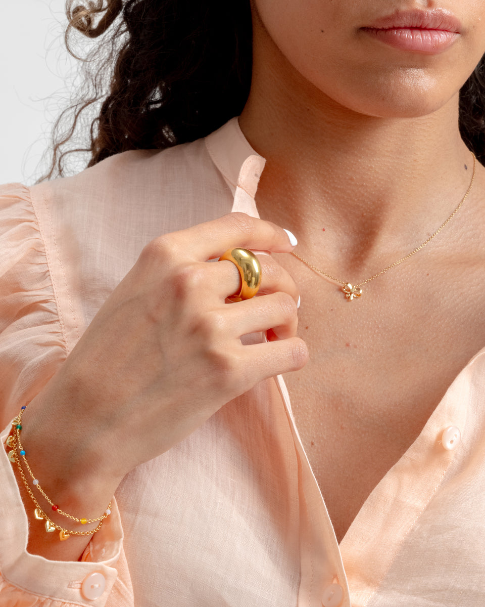 • A product shot of the Bolded Big Ring in gold, displaying its chunky, wide band with a smooth, domed finish.A close-up of a model wearing the Bolded Big Ring in gold, styled with a delicate gold necklace with a clover pendant and a layered gold bracelet with colorful beads and heart charms.A product shot of the Bolded Big Ring in gold, featuring its thick, dome-shaped band with a high-polish finish.A close-up shot of a model's hand resting on her collarbone, showing off the Bolded Big Ring Gold on her ring finger. She is also wearing another gold ring with a three-sphere design on her index finger and a fine gold chain necklace.One of our most popular rings, Bolded Big Ring before it has been polished in our factory in India. All our jewelry is made from 100% recycled sterling silver.The Bolded Big Ring Gold comes in an exclusive Syster P jewelry box, shown here with one box open and one closed.