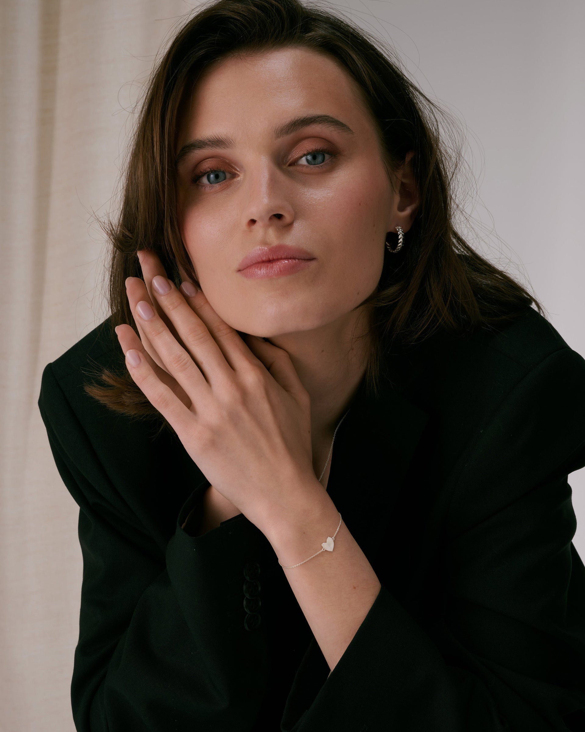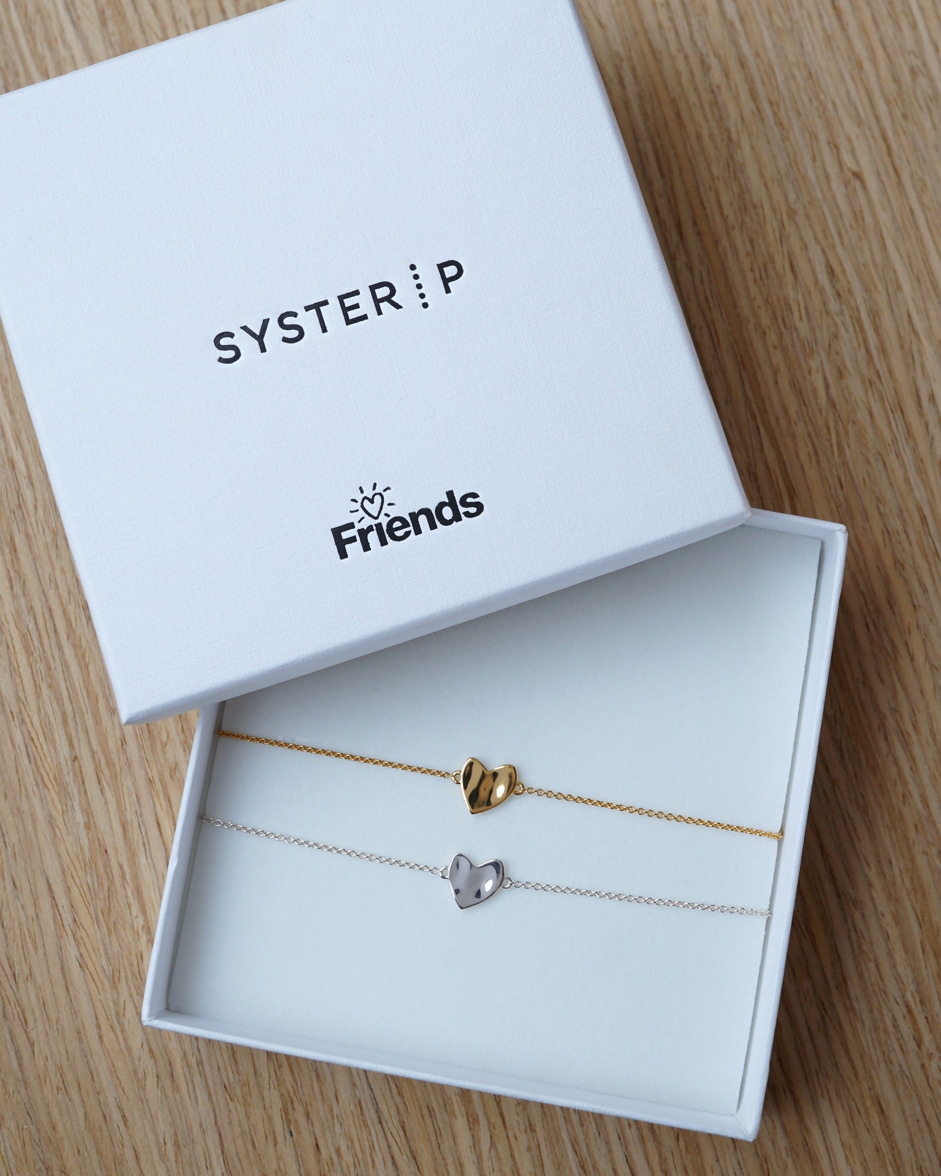 • A close-up of a model wearing three layered silver necklaces: the top Minimalistica Solo Nova Necklace with a white topaz stone, the middle Sheer Mirror Necklace, and the bottom Sunburst Heart Necklace.A product shot of the Sunburst Heart Necklace in silver, featuring a fine chain and a heart-shaped pendant with an engraved sunburst pattern.A product shot of the Sunburst Heart Necklace in silver, featuring a fine chain and a heart pendant with an engraved sunburst pattern.A product shot of the Sunburst Heart Necklace in silver resting on a white Syster P jewelry box tied with a black ribbon, showcasing its heart-shaped pendant with a sunburst pattern.A close-up shot of a model wearing the Sunburst Heart Necklace in silver, featuring a delicate chain and a heart pendant with a sunburst pattern.