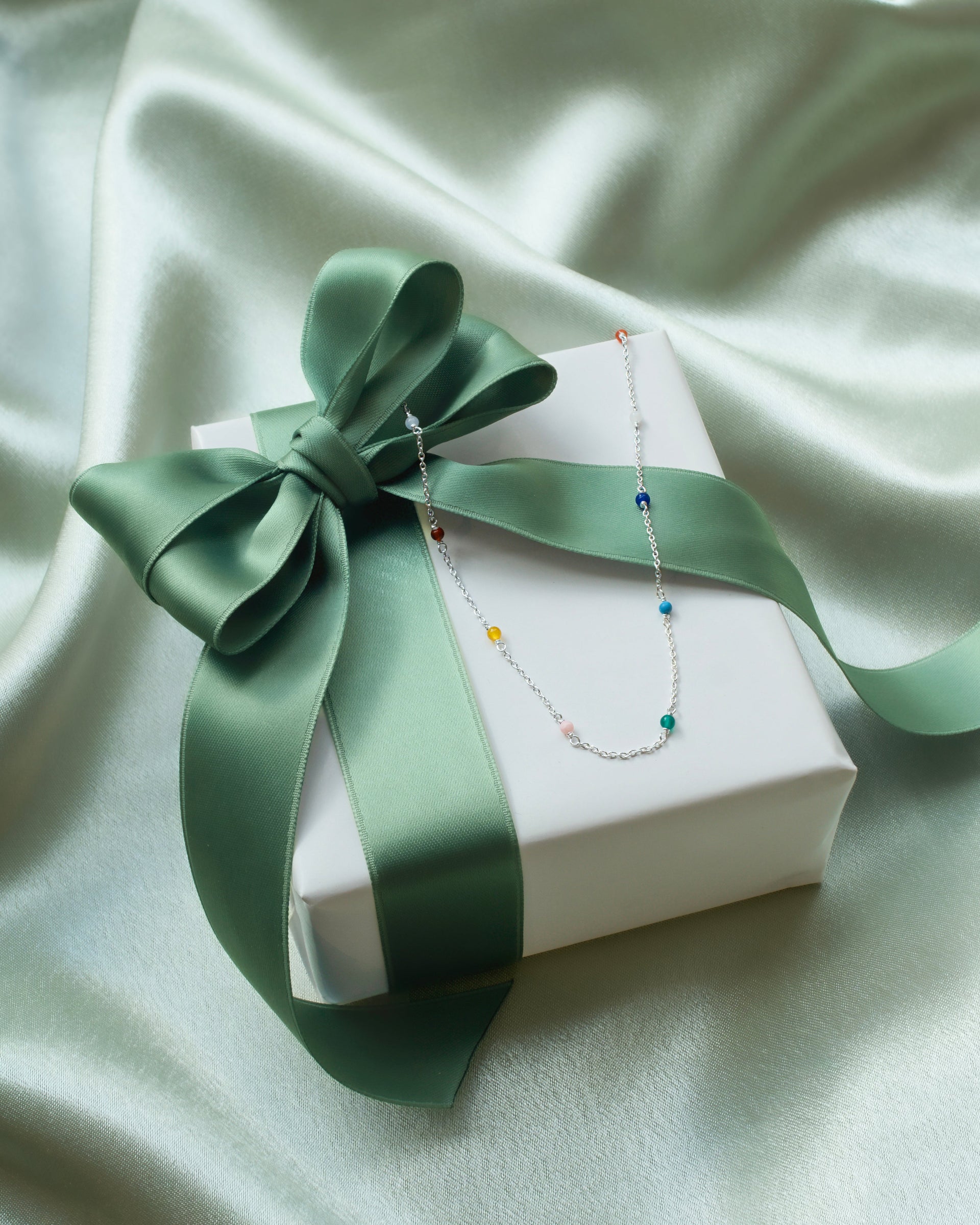 • A product shot of the Santa Monica Bracelet in silver, laid out in a circle to display its design of a fine chain adorned with small, colorful gemstone beads: Yellow Jade, Pink Opal, Sodalite, Green Onyx, Blue Color Reconstituted Turquoise, Vit Agate and Carnelian.A model's wrist styled with a stack of three Syster P silver bracelets: the Santa Monica Bracelet with colorful gemstones, the simple Sheer Mirror chain bracelet, and the Sheer Love linked chain bracelet.