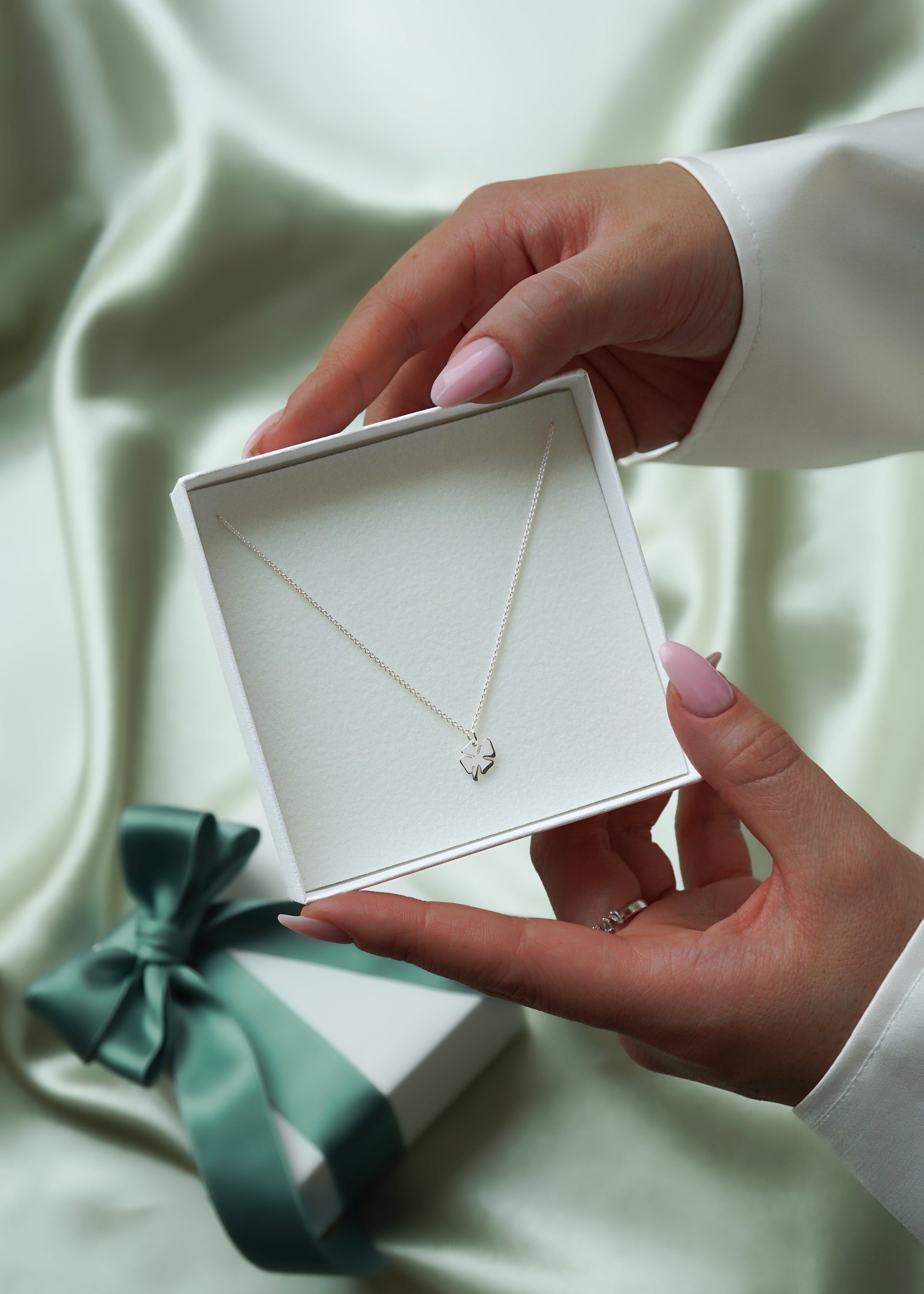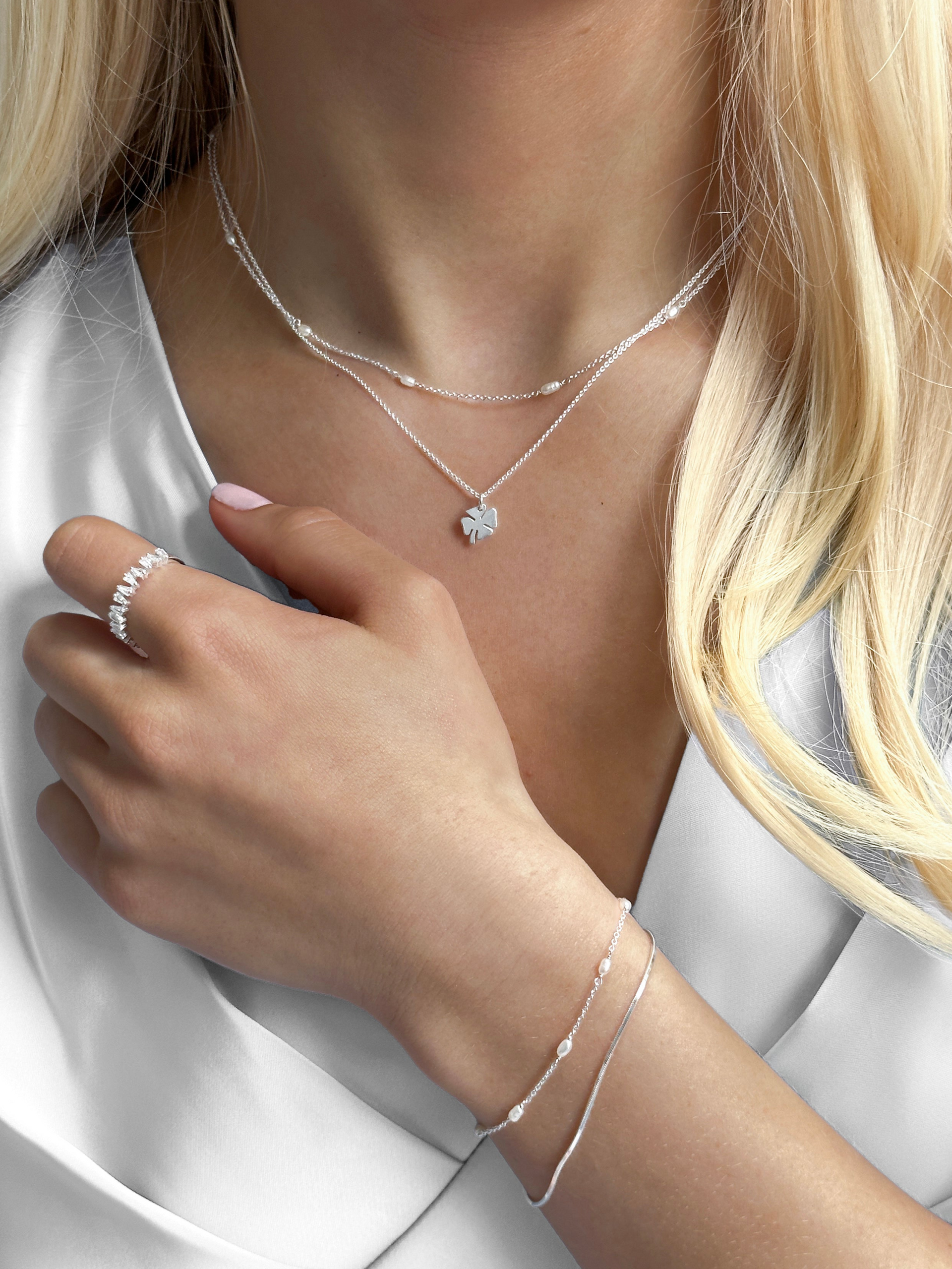• A product shot of the Bring Me Luck Necklace in silver, featuring a fine chain and a small four-leaf clover pendant.A close-up shot of a model wearing a layered set of silver jewelry: the Bring Me Luck clover necklace, the Treasure Multi Pearl necklace, the Treasure Multi Pearl and Sheer Mirror bracelets, and the Iggy ring.