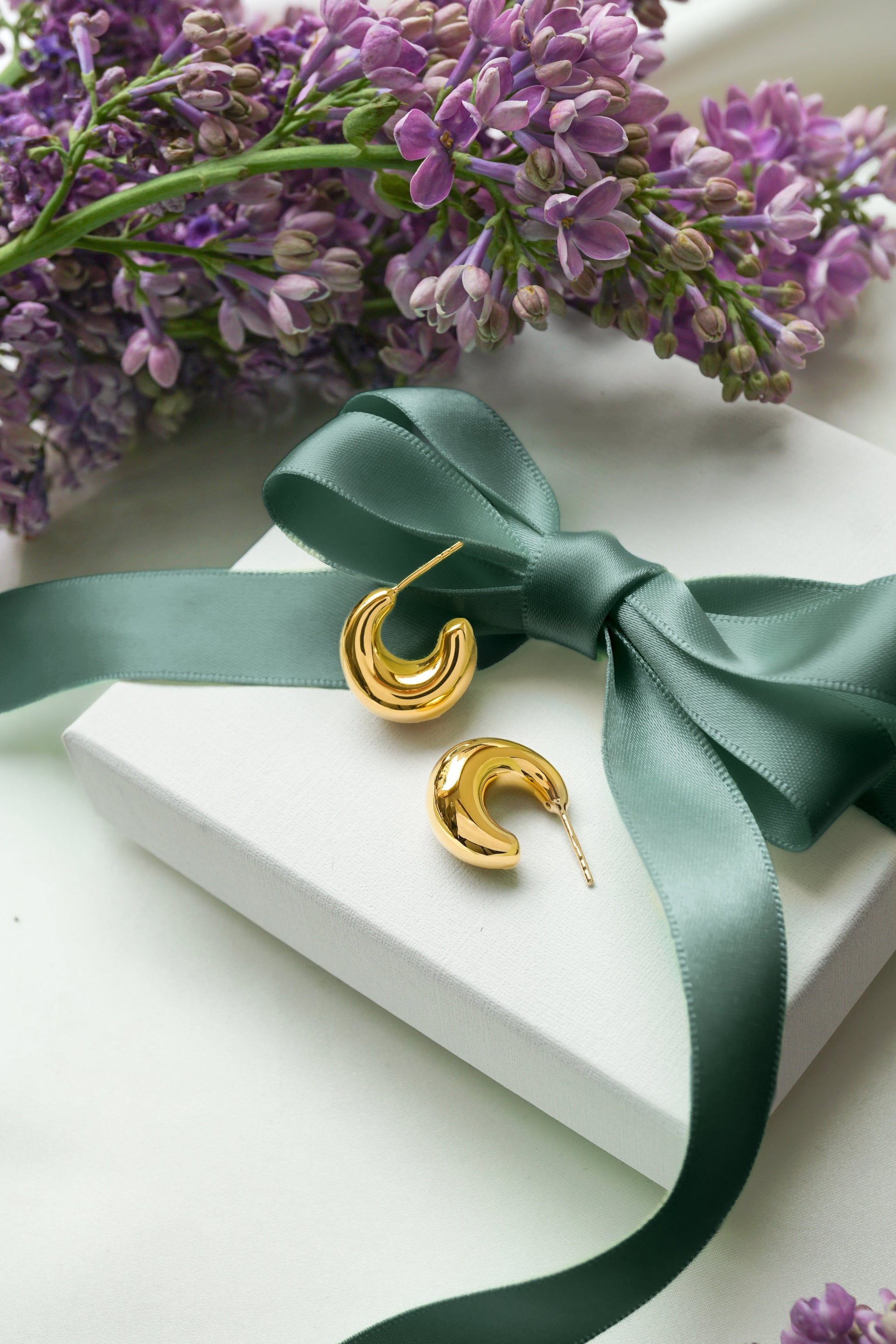 • A product shot of the Bolded Little Sis Earrings in silver, laid out to showcase their chunky, crescent-shaped hoop design.A close-up shot of a model wearing the chunky Bolded Little Sis Earring in silver, showcasing its smooth, rounded, and polished design.