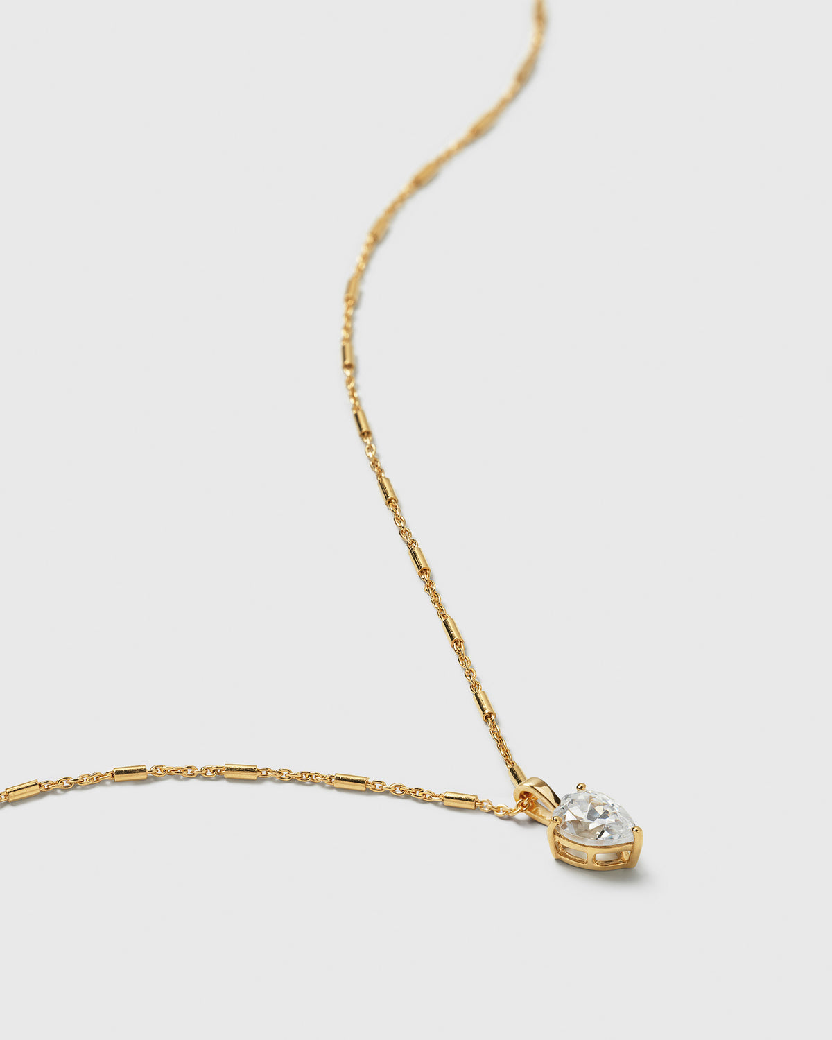 • A product shot of the Katie Necklace in gold, featuring its unique chain with bar-like links and a drop-shaped pendant with a set cubic zirconia stone.Katie Necklace Gold