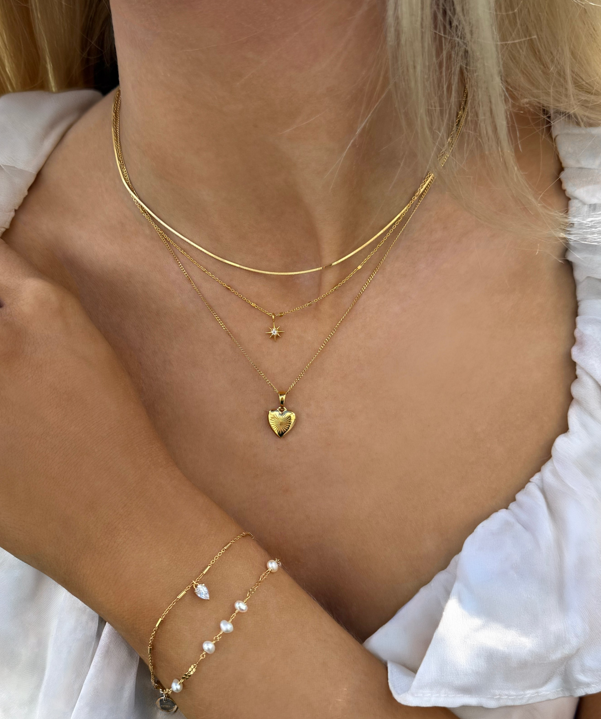 • A product shot of the North Star Necklace in gold, featuring a unique, delicate chain and a star-shaped pendant set with a clear crystal.A close-up shot of a model wearing two layered gold necklaces: the shorter North Star Necklace with a star pendant, and a longer box chain necklace with a pink heart and a letter charm.