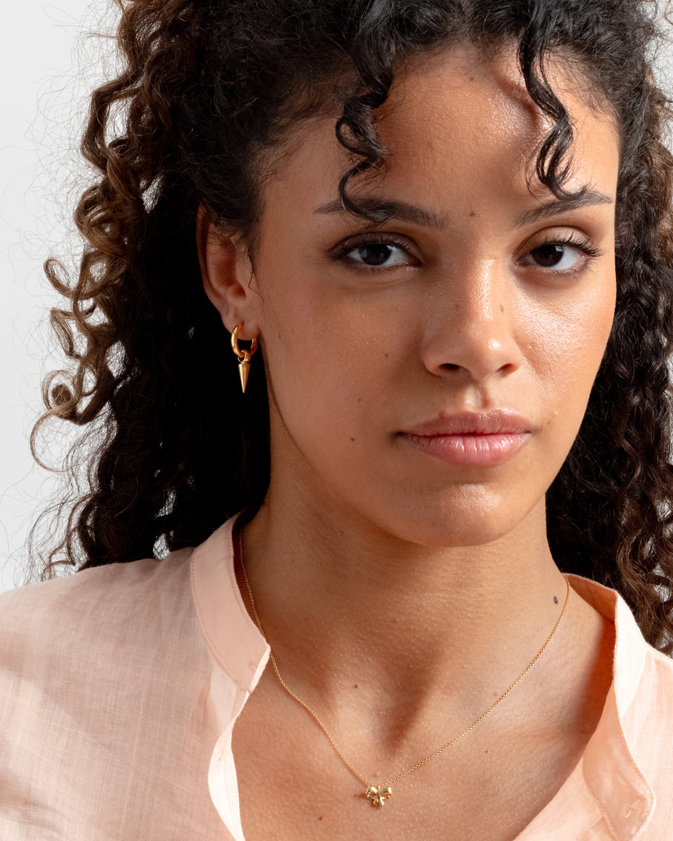 • A product shot of the Bolded Little Sis Earrings in gold, showcasing the pair's chunky and polished C-shaped design.A close-up shot of a model wearing the Bolded Little Sis Earrings in gold, featuring a chunky hoop design with a twisted detail at the clasp, and a matching gold chain necklace.A close-up shot of a model wearing the Bolded Little Sis Earrings in gold, featuring their chunky hoop design. She is also wearing a delicate gold chain necklace with pearls.A product shot of the Bolded Little Sis Earrings in gold, showcasing their chunky, crescent-shaped design.A portrait of a model with curly hair wearing the chunky Bolded Little Sis Earrings in gold and a delicate, layered gold necklace with colorful beads.