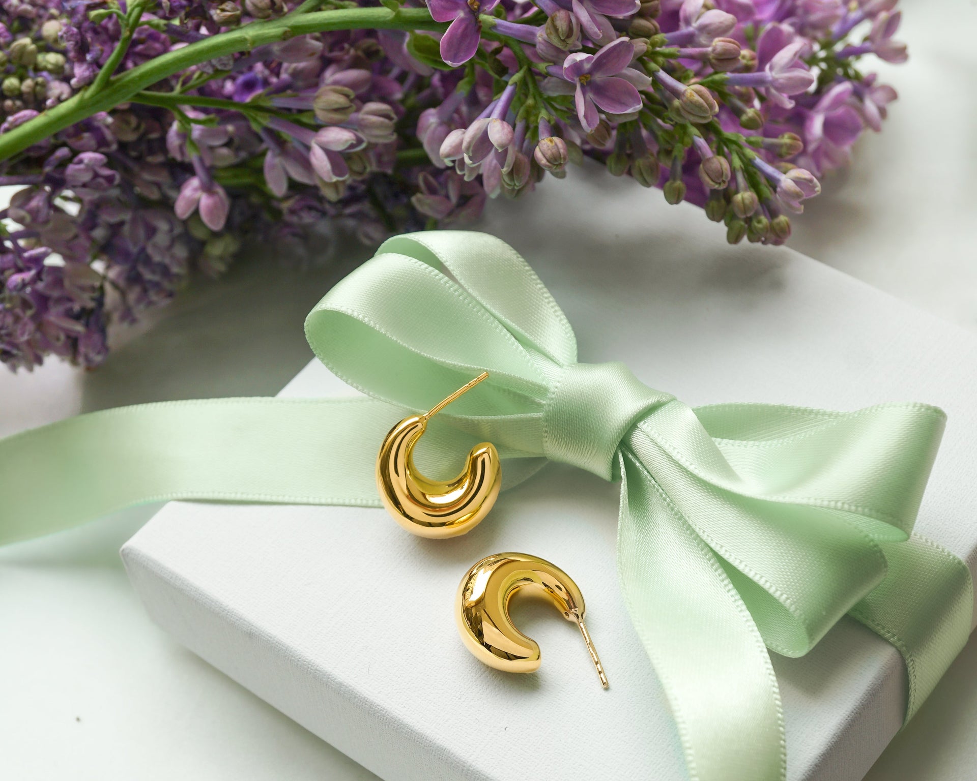 • A product shot of the Bolded Little Sis Earrings in gold, showcasing the pair's chunky and polished C-shaped design.A close-up shot of a model wearing the Bolded Little Sis Earrings in gold, featuring a chunky hoop design with a twisted detail at the clasp, and a matching gold chain necklace.A close-up shot of a model wearing the Bolded Little Sis Earrings in gold, featuring their chunky hoop design. She is also wearing a delicate gold chain necklace with pearls.A product shot of the Bolded Little Sis Earrings in gold, showcasing their chunky, crescent-shaped design.A portrait of a model with curly hair wearing the chunky Bolded Little Sis Earrings in gold and a delicate, layered gold necklace with colorful beads.