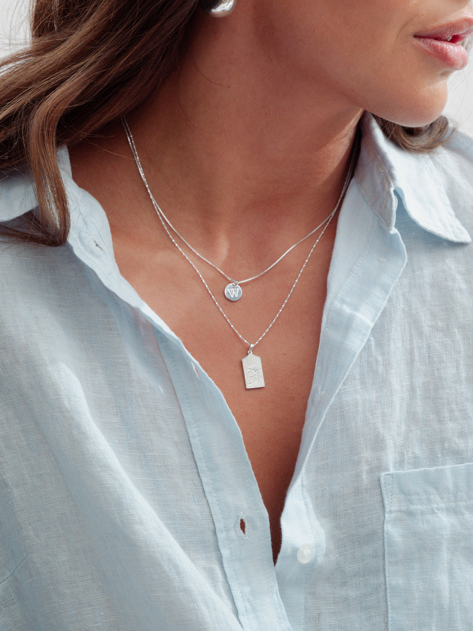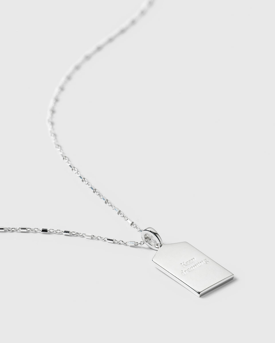 • A close-up product shot of the Lucky Coin Keep Dreaming Necklace in silver, highlighting its rectangular pendant which is engraved with a detailed paradise scene featuring a sun and waves.A close-up of a model wearing three layered silver necklaces: the Lucky Coin Keep Dreaming Necklace with its rectangular paradise pendant, the North Star Big Necklace, and the Herringbone Twisted Necklace.A product shot of the Lucky Coin Keep Dreaming Necklace in silver, showcasing its fine chain and rectangular pendant engraved with a sun and waves design.A close-up shot of a model wearing the Beloved Star Pendant Silver on a delicate chain, layered with a longer silver necklace featuring a rectangular engraved pendant.A close-up of the silver Lucky Coin Keep Dreaming Necklace, showing the back of the rectangular pendant engraved with the words 'Keep dreaming'.