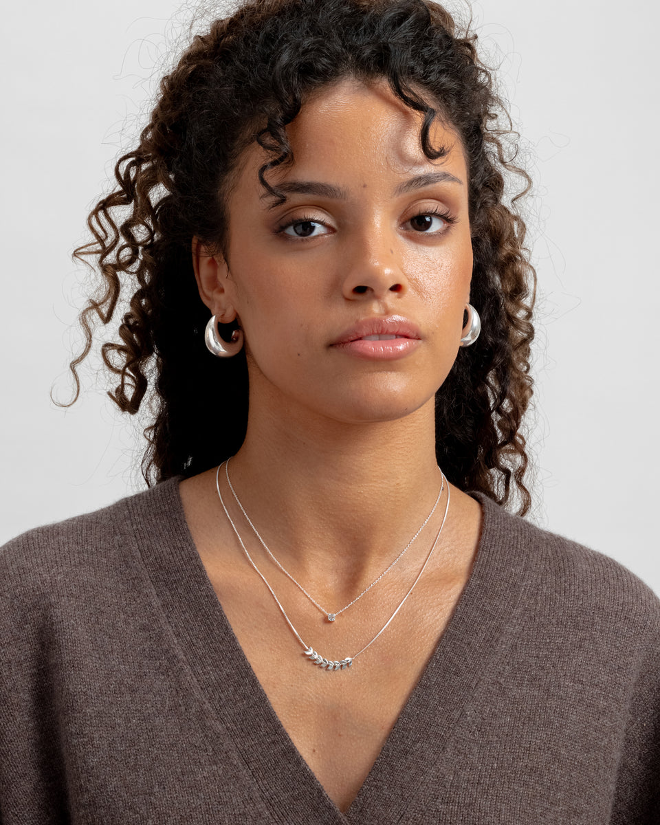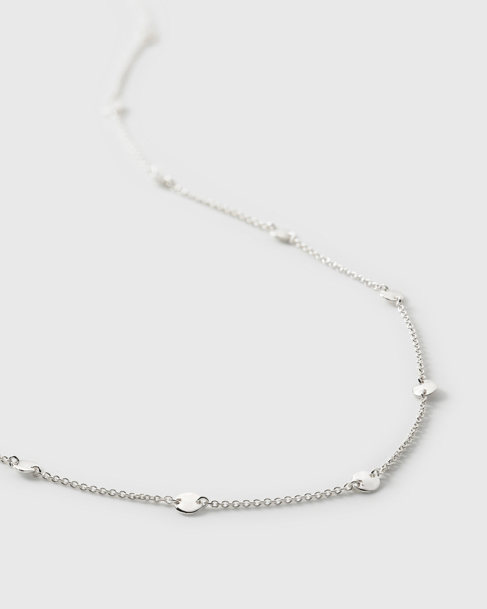 • A close-up image of the Solea Necklace in silver, detailing the fine chain and the small, hammered, round circles spaced along it.A model wears the Solea Necklace in silver, featuring a delicate chain with hammered discs, layered with a silver heart pendant necklace and matching bold heart earrings.A close-up on a model's neck as she wears the Solea Necklace in silver, showing its delicate chain decorated with small, round hammered circles spaced along it.A product shot of the Solea Necklace in silver, laid out to showcase its design of a fine chain adorned with small, round, hammered circles.A close-up of a model wearing the silver Solea Necklace with its hammered circles details, layered with a second silver necklace featuring a hammered open-heart pendant, styled with a blue knit sweater.A model wears the Solea Necklace in silver, featuring a delicate chain with small, hammered round circles, paired with a textured silver hoop earring.