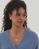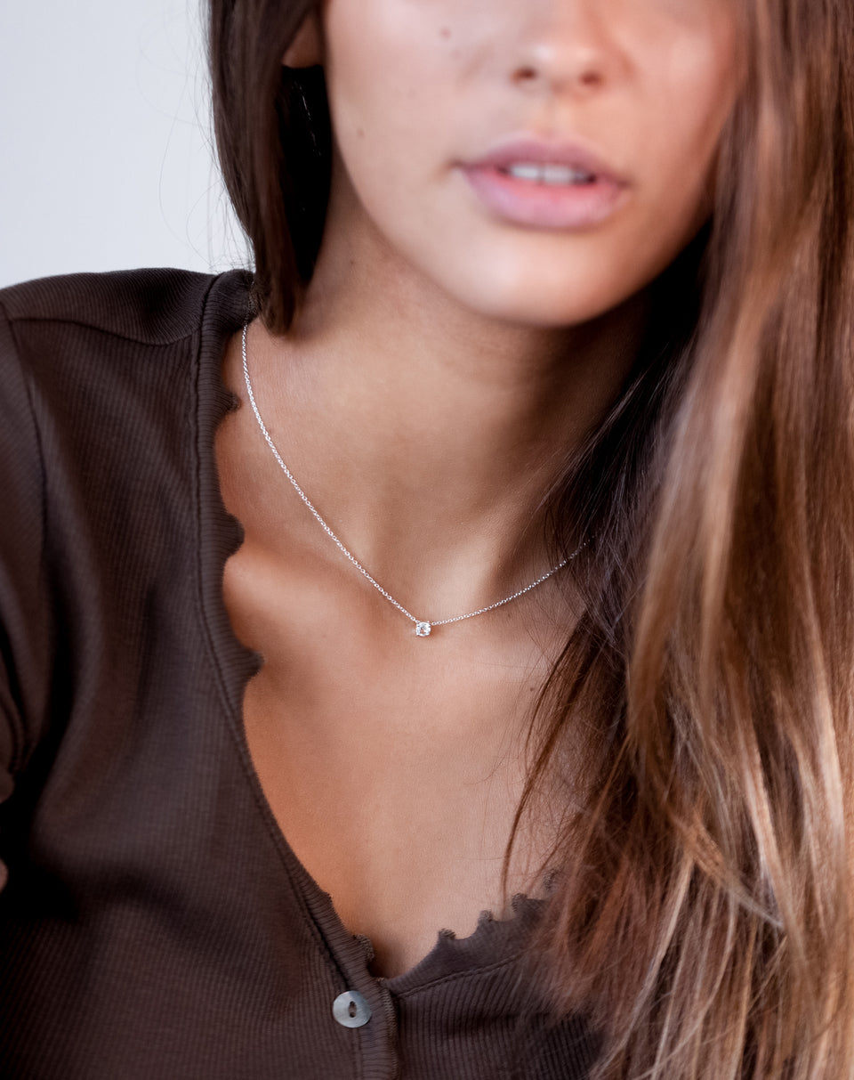 • A close-up of a model wearing the Pam Necklace in silver, styled with a white shirt. The necklace features a delicate chain and a pendant with three sparkling, clustered white topaz stones.A product shot of the Pam Necklace in silver, displayed to show the delicate chain and its beautiful pendant made of sparkling white topazes in various shapes.A close-up product shot of the Pam Necklace in silver, showcasing the intricate pendant composed of various shaped white topaz stones attached to a delicate chain.A smiling model wears the Pam Necklace in silver, featuring a delicate chain and a sparkling white topaz pendant, paired with matching drop earrings.