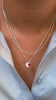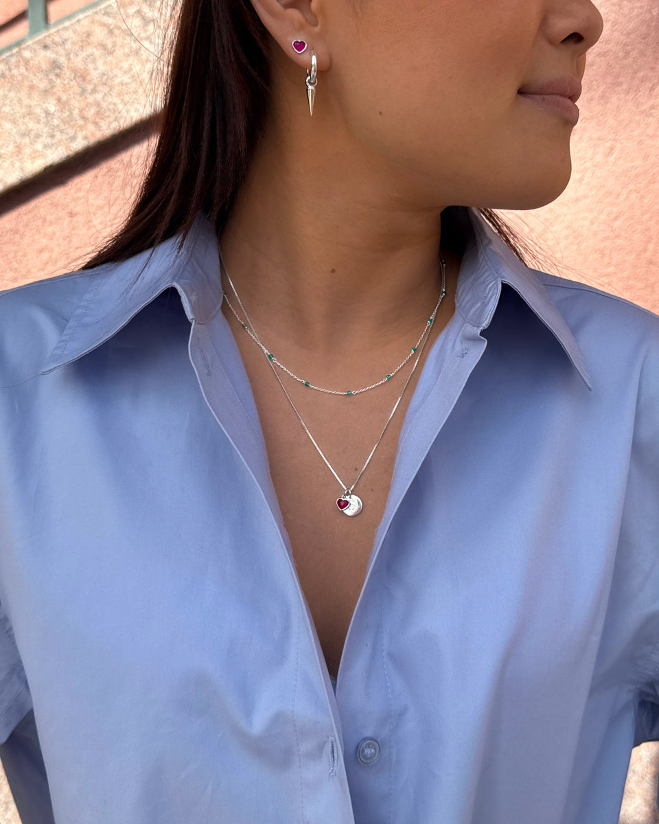 • A product shot of the Sheer Station Necklace in silver, featuring a delicate chain with tiny, shining dots spaced along its length.A close-up of a model wearing a layered silver necklace combination. The shorter necklace is a flat Sheer Mirror chain, and the longer one is a delicate Sheer Station chain holding a Beloved Heart pendant and a Beloved Mini Letter 'E' pendant.A close-up product shot of the Sheer Station Necklace in silver, highlighting its delicate chain design interspersed with small, shining dots.All our jewelry is handmade and made of 100% recycled sterling silver.A model wearing the Beloved Compass Star Pendant in silver, styled on a chain with a round 'M' initial pendant and layered with a second, more delicate silver chain.