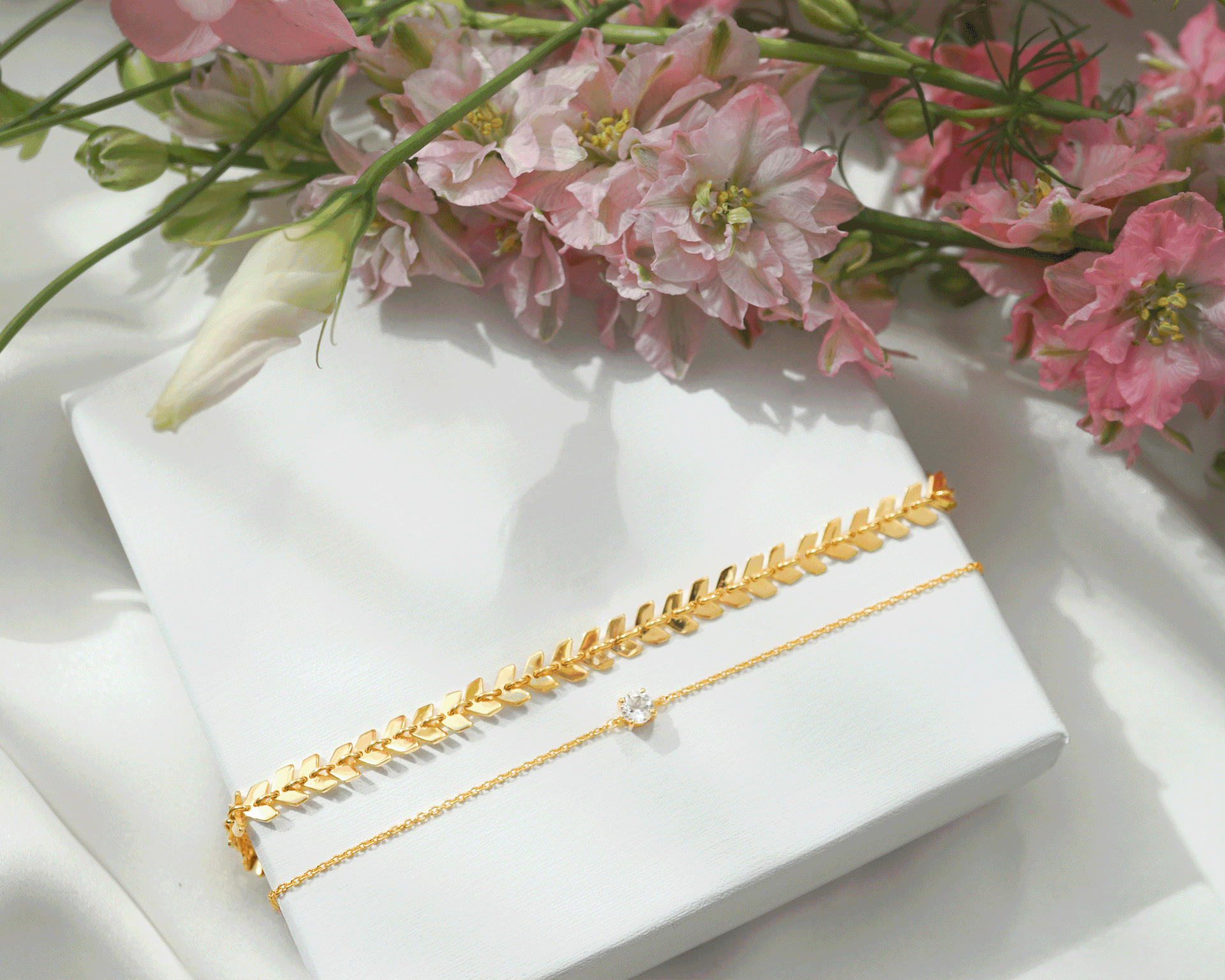 • Studio shot of the Layers Olivia Bracelet in silver, laid out in a circle. The bracelet features a delicate pattern of small, interconnected leaf-like links.A close-up on a model's arm and hand, showing a stack of silver jewelry. She wears the leaf-patterned Layers Olivia Bracelet, the delicate Sheer Station Bracelet, and the Bolded Drops Ring.A close-up image of the silver Layers Olivia Bracelet, detailing its unique pattern of small, interconnected leaf-like links.A close-up of a model's wrist wearing the Layers Olivia Bracelet in silver, featuring a pattern of small leaf-like links. It is layered with the Santa Monica Bracelet, a delicate silver chain with small, colorful beads.A model wears the Treasure Multi Pearl Bracelet in silver, a delicate chain with small freshwater pearls, styled with another silver bracelet featuring a repeating chevron link design.An exclusive Syster P jewelry box, presented both open and closed, showcasing its off-white exterior and soft interior.