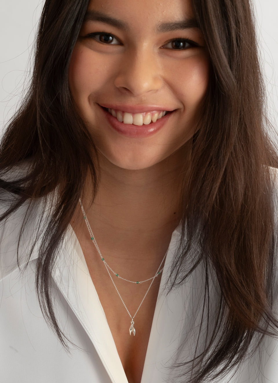 • A product shot of the Santa Monica Necklace in silver, featuring a delicate chain with small, vibrant green onyx stones spaced throughout.A close-up of a model wearing two layered Syster P necklaces: the Santa Monica Necklace in silver with green onyx stones, and the Melinda Double Petal Necklace in silver with a two-petal pendant.A close-up product shot of the Santa Monica Necklace in silver, laid out to showcase its delicate chain design adorned with small, vibrant green onyx stones.A close-up on a model's neck showing a layered necklace look featuring the silver Santa Monica Necklace with green onyx stones, the Sheer Station Necklace, and a shorter necklace with the Beloved Mini Letter and a pink Beloved Heart Pendant.