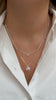 • A product shot of the Beloved Heart Pendant in silver, showing the small, polished heart-shaped charm.A close-up of a model wearing a layered silver necklace combination. The shorter necklace is a flat Sheer Mirror chain, and the longer one is a delicate Sheer Station chain holding a Beloved Heart pendant and a Beloved Mini Letter 'E' pendant.All our jewelry is handmade and made from 100% recycled sterling silver.A product shot of two Beloved necklaces, one in gold with a heart pendant and a mini 'S' letter pendant, and one in silver with a heart pendant and a mini 'M' letter pendant, both on box chains.