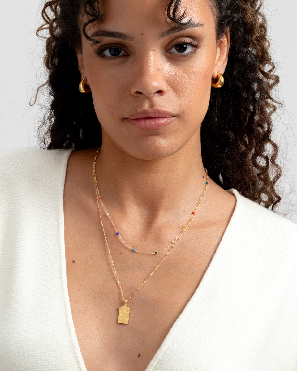 • A product shot of the Santa Monica Necklace in gold, laid out to display its design of a fine chain adorned with small, colorful gemstones: Yellow Jade, Pink Opal, Sodalite, Green Onyx, Blue Color Reconstituted Turquoise, White Agate, and Carnelian.A close-up of a model wearing the Santa Monica Necklace in gold, a fine chain with small colorful gemstones, layered with another gold necklace featuring a rectangular pendant and paired with chunky gold hoop earrings.A close-up of a model wearing the Santa Monica Necklace in gold, featuring a fine chain with colourful gemstones, layered with a second gold necklace holding a crystal heart pendant and a disc charm with the letter E.All our jewelry is handmade and made of 100% recycled sterling silver.A close-up product shot of the Santa Monica Necklace Gold, laid out to showcase its delicate gold chain adorned with small, vibrant, multi-colored gemstone beads: Yellow Jade, Pink Opal, Sodalite, Green Onyx, Blue Color Reconstituted Turquoise, White Agate, and Carnelian.A model wears the Santa Monica Necklace in gold, a fine chain with colorful stones, styled in a layered look with another gold necklace featuring a rectangular sun pendant.