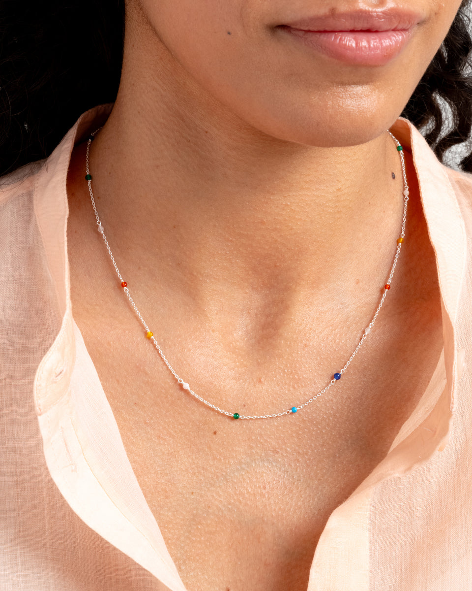 • A product shot of the Santa Monica Necklace in silver, laid out to display its fine chain design adorned with small, colorful gemstone beads: Yellow Jade, Pink Opal, Sodalite, Green Onyx, Blue Color Reconstituted Turquoise, White Agate, and CarnelianA close-up shot of a model wearing the Santa Monica Necklace in silver, showcasing its delicate chain adorned with small, colorful gemstones.A product shot of the Santa Monica Necklace in silver, laid out to display its design of a fine chain adorned with small, colorful gemstone beads: Yellow Jade, Pink Opal, Sodalite, Green Onyx, Blue Color Reconstituted Turquoise, White Agate, and CarnelianA close-up shot of a model wearing the Santa Monica Necklace in silver, a fine chain adorned with small, colorful gemstones, and a textured silver earring.A close-up on a model wearing the Santa Monica Necklace with colorful gemstones, layered with a silver box chain necklace featuring a mini letter 'L' charm and a pink quartz heart charm.