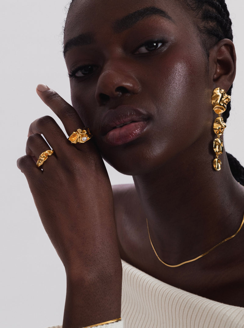 Long statement earring inspired by nature. The irregular surface catches the light and makes it the center of attention. Made of 100% recycled sterling silver, plated with 18K gold. The earring was originally handcrafted in clay, resulting in organic shapes and textures.