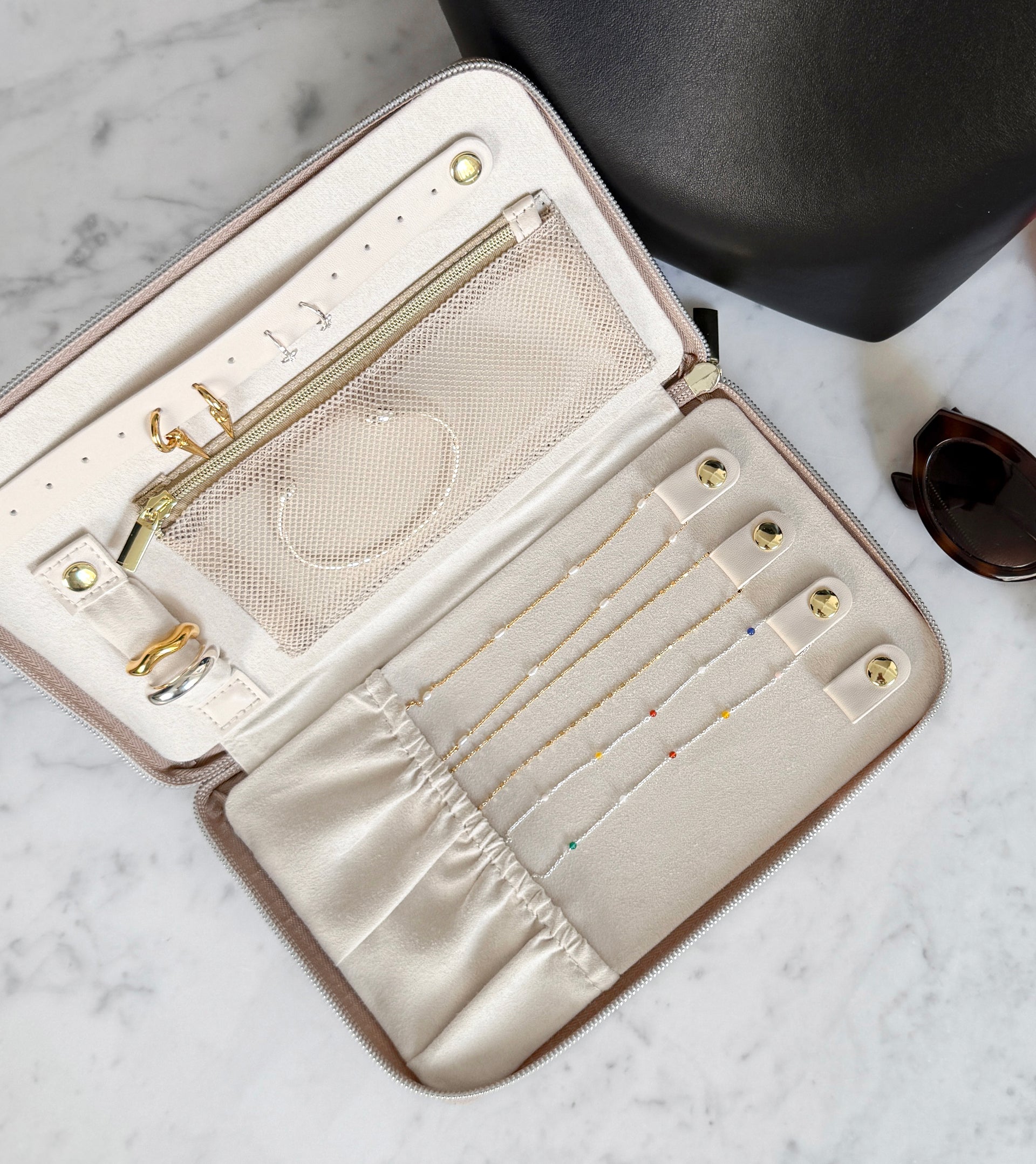 Det perfekte smykkeskrinet for å holde orden på alle smykkene dine, både hjemme og når du er på reise. Laget i nudefarget vegansk lær med beige mikrofiberstoff på innsiden. Med sine lommer og rom er det designet for å holde halskjeder, ringer, armbånd og øredobber organisert og uten flokking. Etuiet har en glidelås og en logo med gullfinish.